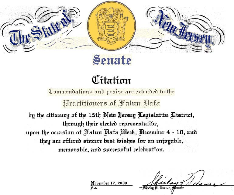 新泽西第15选区的参议员代表他们的选民,褒奖法轮大法修炼者: 最衷心地祝愿12月4-10日的“法轮大法周”庆祝活动愉快,难忘,成功。