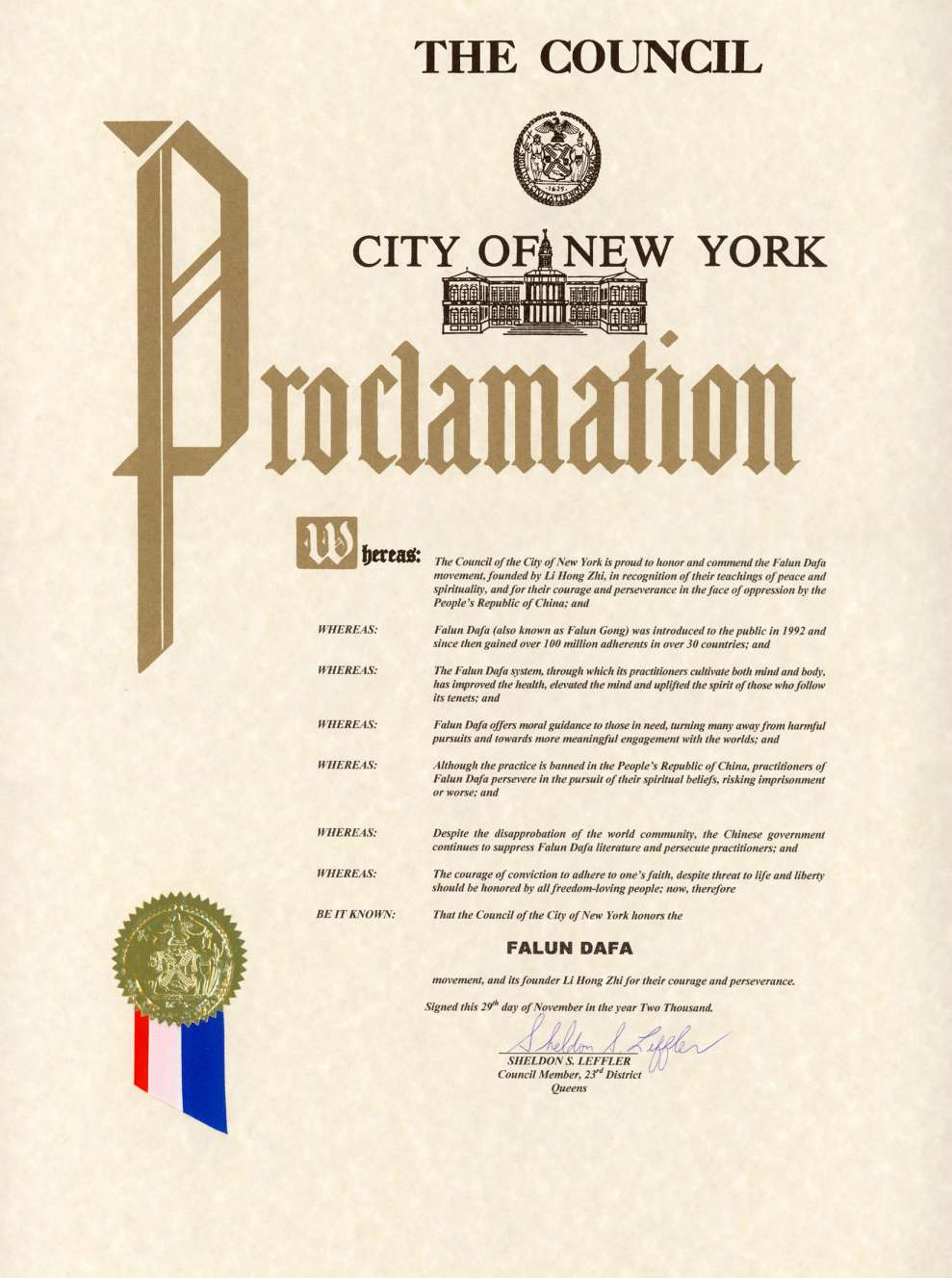 鉴于纽约市市议会荣幸地授予和推荐由李洪志先生创建的法轮大法,以表彰他们倡导的和平与高尚精神,以及面对中国的压制他们所表现的勇气和坚韧;