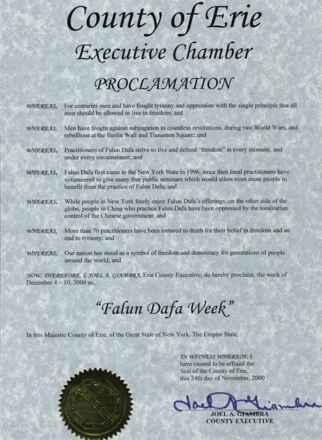 鉴于 法轮大法自一九九六年传入纽约州以来,修炼者们自愿为公众提供了许多免费讲座,使更多人能够通过习炼法轮大法而受益;