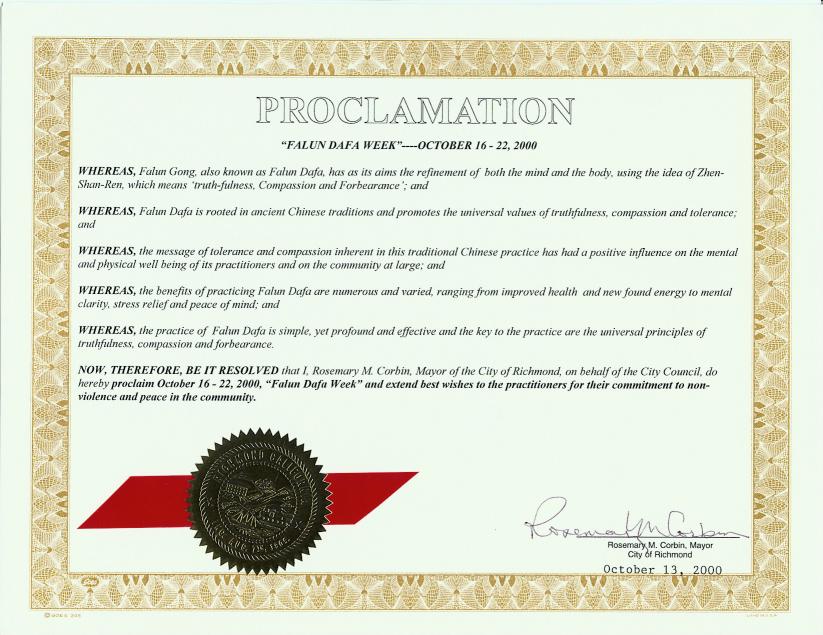 NOW, THEREFORE, BE IT RESOLVED that I, Rosemary M, Corbin, Mayor of the City of Richmond, on behalf of the City Council, do hereby proclaim October 16-22, 2000, “Falun Dafa Week” and extend best wishes to the practitioners for their commitment to non-violence and peace in the community.