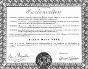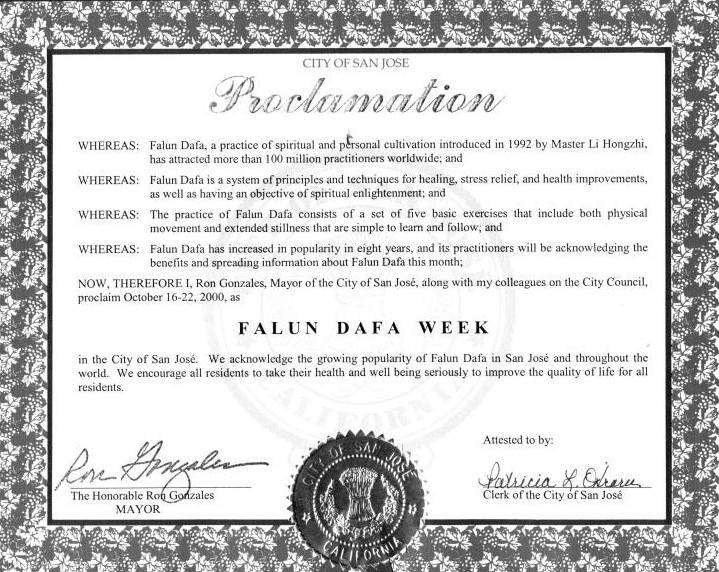 in the City of San Jose. We acknowledge the growing popularity of Falun Dafa in San Jose and throughout the world. We encourage all residents to take their health and well being seriously to improve the quality of life for all residents.