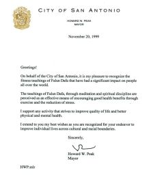 圣安东尼奥市 哈佛W皮克 市长 1999年11月20日 贺信! 我很高兴地代表圣安东尼奥市嘉奖法轮大法的适宜教导对全世界人民的巨大影响。 法轮大法的教导,打坐和精神自律被认识到是通过炼习和减少压力而有益健康的有效方法。 我支持任何努力改善人生质量和达到更好身心健康的活动。 因为你们的努力跨越文化和种族界限改善了许多人的人生,我向你们致以最美好的祝愿。 忠诚的, (签名) 哈佛W皮克 市长