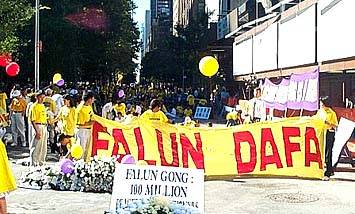 法轮功的诉求强烈到什么程度?从昨天中午沿路民众的交相闲谈就可体会一二,不懂什么是法轮功的人,很快就会被朋友「教育」说「那是个被中共压迫的气功学派」,沿路听到类似交谈不下数十次。法轮功的学员沿路散发英文传单,学员重伤住院的照片和其家居照片并列,索阅的民众立刻就得到清楚的讯息。