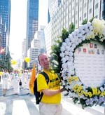 来自各地的法轮功学员昨天在纽约曼哈坦发动千人游行,游行队伍中也出现少见的洋学员,举着列有死难学员姓名照片的花圈。