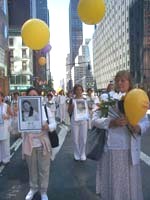 千名法轮功学员,昨日由捧着五十位受虐致死的法轮功学员遗照的人员前导,在曼哈坦第三大道上安静肃穆的步行。