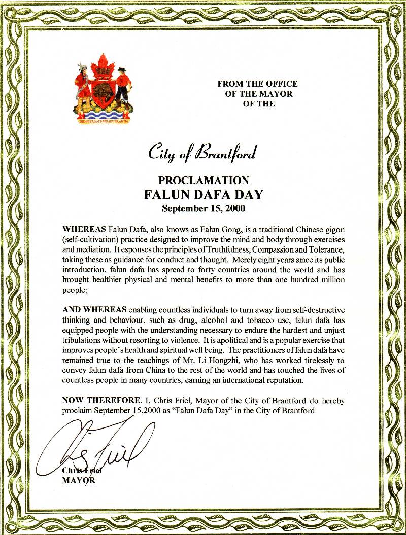 因此,我,克里斯福利尔,布兰特福德市的市长在这里宣布2000年9月15日为布兰特市的“法轮大法日”。