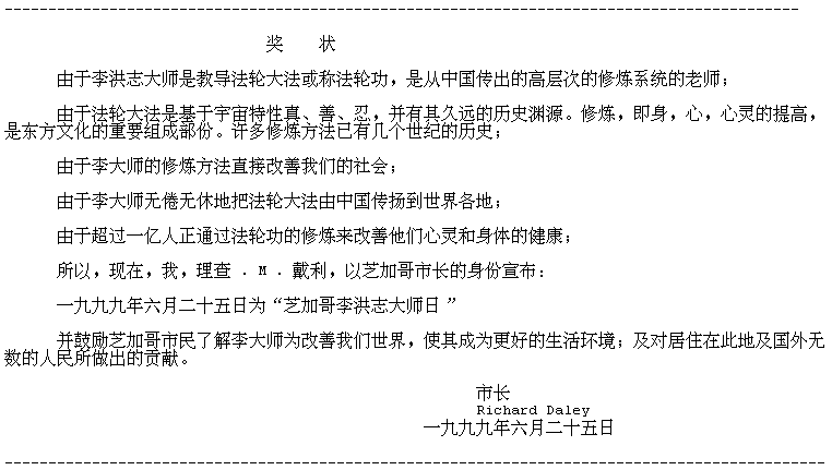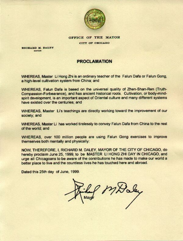 美国芝加哥市市长宣布“芝加哥李洪志大师日”