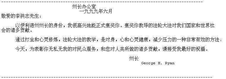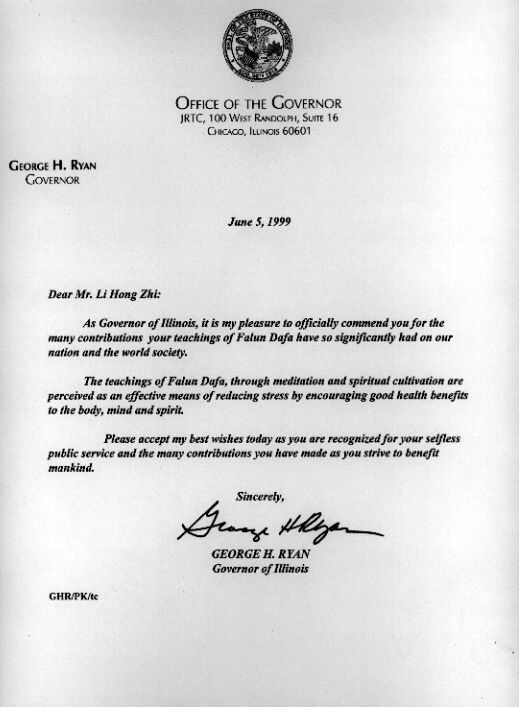 美国伊利诺思州州长致李洪志老师的嘉奖信