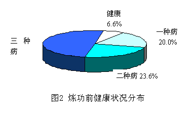 调查结果表明,修炼前患一种疾病的有2,547人,占20%,患二种疾病的3,004人,占23.6%,患三种以上疾病6,341人,占49.8%,有病人数合计11,892人,占总调查人数的93.4%,见图2。修炼后健康状况变化见表3,完全康复6,962人,占58.5%;基本好转2,956人,占24.9%,修炼后祛病总有效率为99.1%。将三种不同程度患病者修炼后身体变化状况,作健康状况变化百分图(图3)。