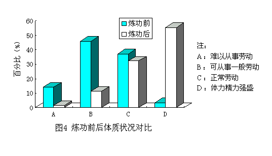 3.6 修炼前后体质状况比较:表4显示被调查人群修炼前后体质状况。经计算,修炼后体质得到增强者9,871人,体质改善率80.3%;其中“体力精力强盛”者从修炼前3.5%增加到修炼后的55.3%。图4比较了修炼前后被调查人群体质状态的分布百分比。