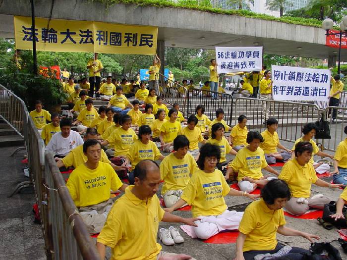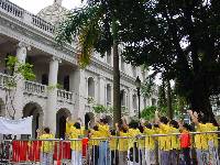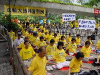 虽然是工作日,但很多学员特地请假来表达自己的心愿。约150人参加了此次活动,是请愿团体中最庞大的一支队伍,也是最和平、理性的一个团体。整齐的炼功队伍,优美的音乐,祥和的场面,没有叫嚣,没有激动。这天风很大,扯得几幅大横额绷的紧紧,特别注目。周围的铁栏杆上也挂了不少学员制作的镇压法轮功的彩图,引起路人的关注。不少人坐在後面的石凳上观看我们炼功,也有人特地走过来索要资料。