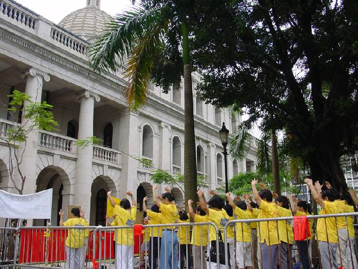 下午两点前後,议员和政府官员陆续到场了,大法学员代表向到场的董特首以及政务司司长陈方安生成功递交了请愿信及有关资料,希望他们关注月前被中国公安人员非法逮捕的两名法轮功学员(因控告江泽民而被捕),并对其中的香港永久居民朱柯明立即施以援手,使他早日获得自由。同时也希望特区政府能够协助法轮大法学员向有正义良知的中央领导反映真实情况,促使中国政府制止江泽民一夥对法轮功的非法镇压,早日释放所有被关押的学员,还法轮大法以及其创始人以清白。请愿信以及两位学员对江的起诉状、说明真象的小册子等等也都被送至立法会的秘书处转交给各位议员。