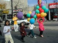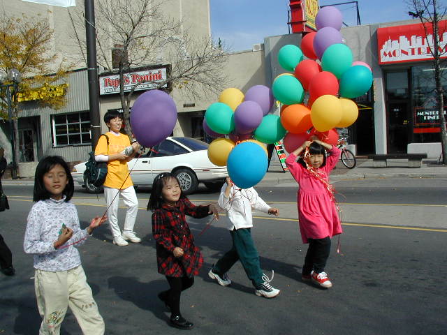 下午一点半,在当地警察的卫护下,相伴着小弟子们手拿的七彩气球,学员们拿着巨大的法轮图形、“法轮大法”、“请释放中国被关押的法轮大法学员”等横幅,在市中心最热闹的一条大街上游行。欢庆、庄严而又平和的队伍使街上的路人停下了脚步,向学员们了解法轮大法,开车的司机也不由得索要报纸。当到达游行终点,护送的警察也开始向学员们了解大法。