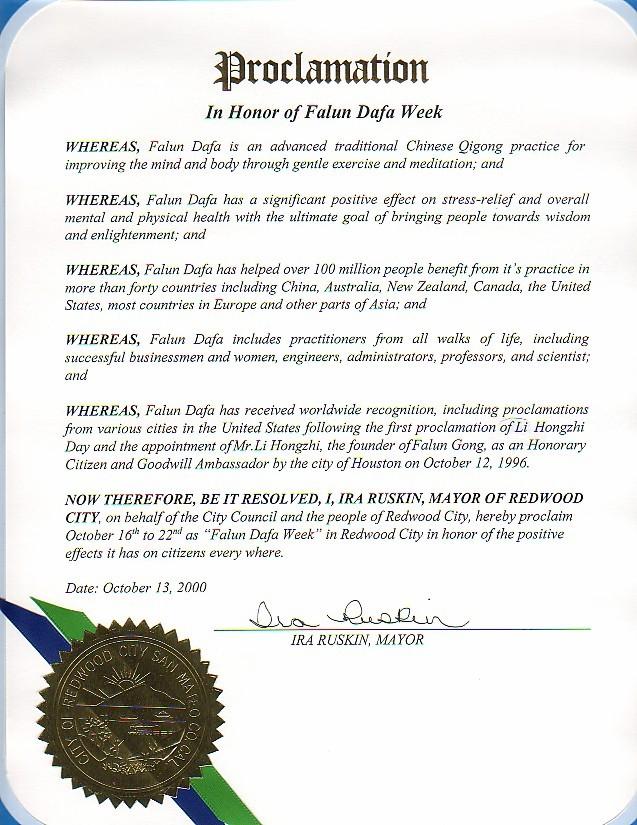 现在,因此我,红木城市市长伊勒.拉斯金,代表市议会及红木城市人民,特此宣告2000年10月16日到10月22日为红木城市法轮大法周,以嘉奖法轮大法对各地公民的良好作用。