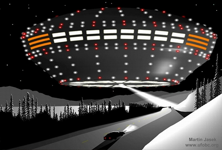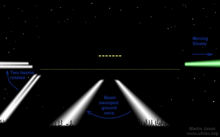 就在它的中心部位,一束光以45度角照射它移动方向的前方。然后向后扫描45度,然后熄灭。另外,在物体的前面有一些绿光。因为空中有冰晶,所以我看得很清楚。在该物体后面有两束白光,它们在物体的后部向下发光,然后光束旋转着抬起直至与物体水平。我估计物体移动速度为每小时5到10英里,它在我右面慢慢移动。在物体上,有一条长长的光线,它们是方的,不是圆的,是长方形,大约9英尺高,20英尺长。