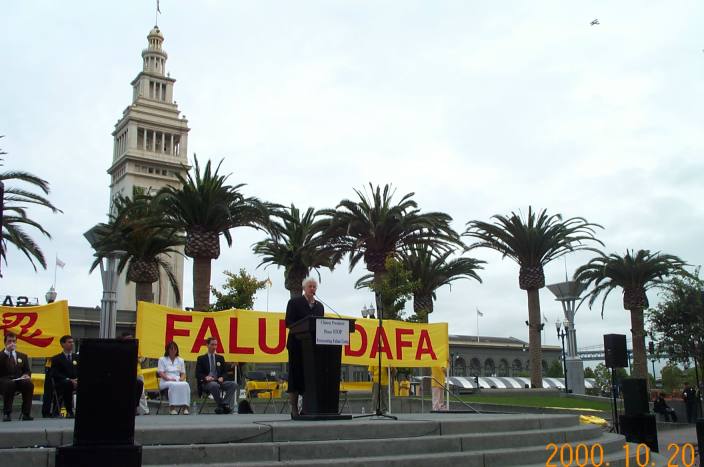 (三)、学员们在游行的终点处集中参加了由三位美国国会议员蓝托斯(Lantos)、裴洛西(Pelosi)和艾许(Eshoo)联合举办的“法轮大法新闻发布会”。会上,大法学员代表宣读新闻发布稿揭示了大陆学员所遭到的迫害真相,玛琪瑞(Margery)女士代表蓝托斯先生发言。裴洛西议员女士刚下飞机就直接赶到会场,并作了深刻有力的发言,她说:“如果中国政府一日不停止对法轮功学员的迫害,我们就一日不停止道义上的谴责”。各家中英文媒体争相进行了采访报道。