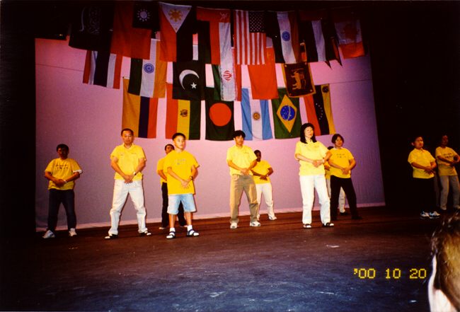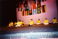 晚上九点多了,我们正式上台演示法轮功功法,大家都有一个共同的愿望:尽我们最大的努力,让世人知道法轮大法好。报幕员说:“法轮功是传统中国文化的精华,但一年前中国政府开始镇压法轮功,尽管如此,他们仍然顽强地坚持自己的信念,让我们欣赏他们的优美功法”。接着,帷幕徐徐拉开,伴随着炼功音乐,包括两位小学员在内的十二位学员一起展示法轮功法,大家动作整齐,面带祥和之意,一位学员同时解说功法。四百多位学生教授入神地观看,与祥和的炼功场面浑然一体,构成了一幅动人的画面。全部五套功法演示完,剧场内爆发起经久不息的掌声,人们深深地为法轮大法的慈悲祥和所震撼。