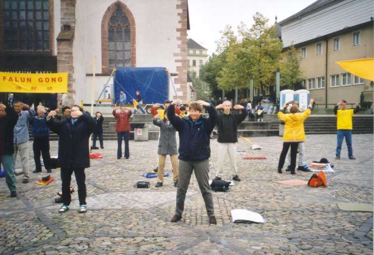 大部分学员随着悠扬的音乐在广场上向人们展示我们的五套功法。另一部分学员在放满德,法,英,中四种语言的宣传资料的桌前回答行人的各种问题。还有几个学员在广场前的人行道上分发传单。