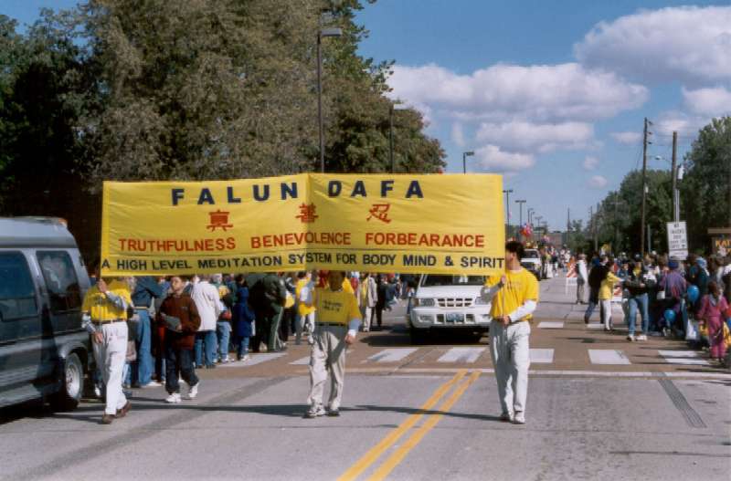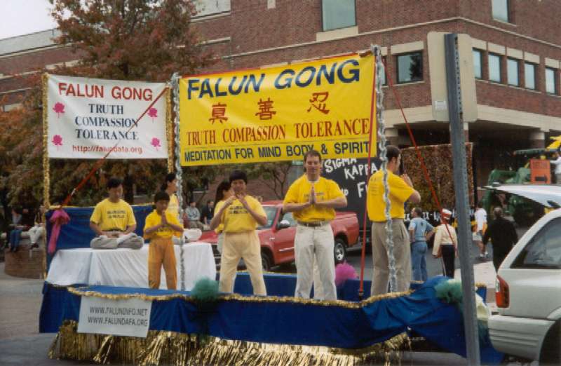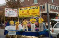 游行队伍由三位学员高举一3.2英尺的横幅开道,横幅上“法轮大法”,“真、善、忍”,“高层次修心健身功法”三行大字在黄底衬托下份外引人注目。紧随其后的彩车上学员们随着大法音乐不间断地演炼功法,八位学员炼动功,两位学员打坐。在彩车旁边四位学员沿路向观众散发传单和报纸。