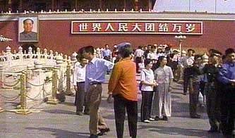这些抗议者在人们庆祝建国五十一周年的时候在天安门广场举起写有法轮功字样的横幅。