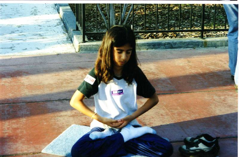 在我们斜对面的一家人租的摊位上有个十岁的小姑娘。她一直在认真地观察我们。后来,她过来问我们这是什么,能不能教她。她非常认真地跟我们学员炼完了五套功法。打坐时,她一下子就双盘了近半小时。这天其余的时间她都和我们一起炼功(见附图)。第二天,她带来了另一个更小的女孩,满怀希望地看着我们问,她能不能也来学功。这一天,这两个小姑娘就一直跟着我们炼功。最后临走时她们留下了家庭地址,我们答应以后给她们寄教功带去。