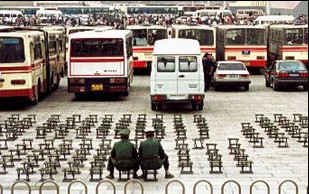 在北京天安门广场,大批公安及解放军,一早在广场上戒备,力图阻止一批法轮功学员在广场上集会示威。(美联社)