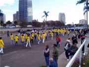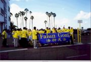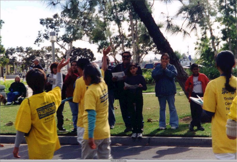 周六上午,学员们和其他游行队伍聚集在郡政府大院一同等候出发。 部分学员利用这段时间席地打坐,这吸引了挨着我们队伍的女童子军围观,看到众多的孩子们观察的那么专注,几个学员就坐下来教她们第五套功法。令人感动的是她们每个人都学得非常认真。这时领队的则跑了过来索取资料,表示会与学员联系将来学功的事宜。上午11点,游行准时开始。开头是举着牌子的童子军,每块牌子分别标出了美国参加过的历次战争的伤亡失踪人数,然后是举着军旗的退伍军人。跟着的队伍里有参加过二战、韩战、越战等的退伍老兵和被俘军人,有各当地驻军的仪仗队,有高中军训营的学生,有高中的军乐队,最后是法轮功的队伍。法轮功的队伍以中英文蓝底黄字的法轮功横幅为先导,六名小学员紧随其后,身着黄T恤衫的近五十名学员排成四路纵队在普渡济世的音乐声中行进,受到了路边观众的热烈欢迎,人们不断地向我们挥手,欢呼,大家也向观看的行人微笑挥手致意,形成了场内外融合一体的祥合场面。几名学员散在队伍两侧向观众分发报纸传单,很多人更是主动上前索取资料,最后当队伍经过检阅台前,主持人在扩声器中宣布:“现在走过来的是法轮大法的队伍,法轮大法是修炼身心的功法,遵循真善忍。”此时,周围响起了热烈的掌声。