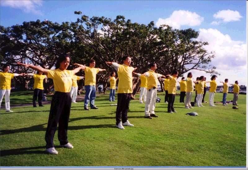 游行结束后大家来到附近著名的旅游风景点海港村,在风景秀丽的海边炼功。一场夜雨后的空气特别干净,朵朵白云飘在湛蓝的天空下,大家身着鲜艳的黄T恤衫,与自然景观汇成了一副美丽的图案,吸引了过往许多游客前来询问交谈。炼功后两地的学员自由交流了近期弘法活动的经验体会。大家都体会到我们今后应该将更多的弘法和说明真相的活动融入主流社会活动,这样就能让西方社会更多的人了解认识大法而为将来更多的人得法奠定基础。