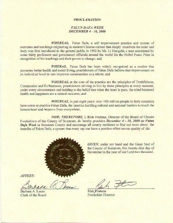 在此,我,瑞克.方塔纳,以索摩塞郡委会主席的名义宣告:2000年12月4日至10日为“索摩塞郡法轮大法周”,同时鼓励所有本郡居民去亲身感受并受益于法轮大法--这个众所周知的提高生活品质的修炼系统。