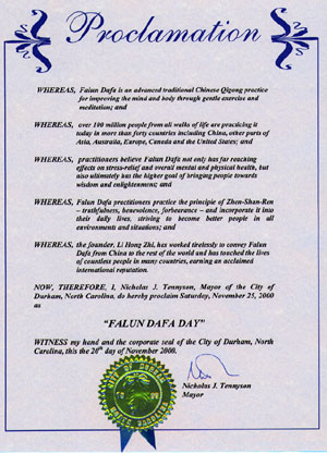 2000年11月20日,美国北卡州德伦市(Durham,North Carolina)市长颁发证书宣布11月25日为“法轮大法日”。