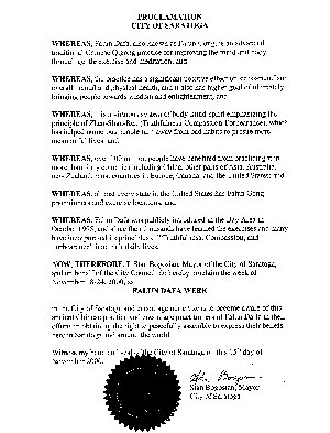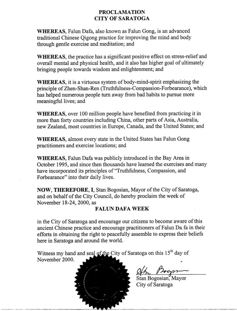所以,现在,我,斯坦 博高新,萨拉托加市市长,代表市议会,在此宣告,2000年11月18日至24日为萨拉托加市的法轮大法周,并鼓励我们的市民们认识这种古老的中国的炼习,并对法轮大法学员们为争取和平集会及表达信仰的权利在萨拉托加市和世界各地所作出的努力表示鼓励。