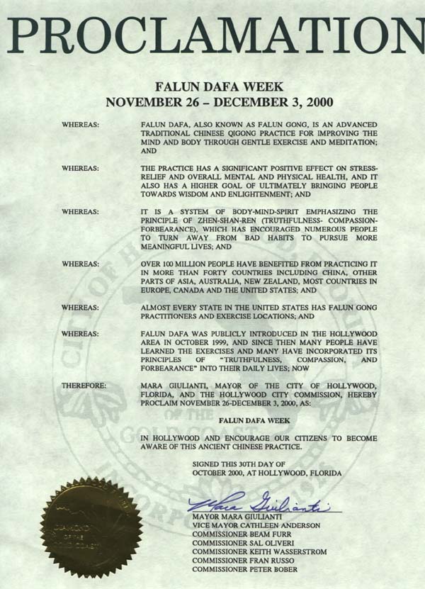 鉴于,法轮大法在1999年10月在好莱坞市公开传出,随后许多人学炼,并将“真、善、忍”的原则结合在他们的每日生活中。