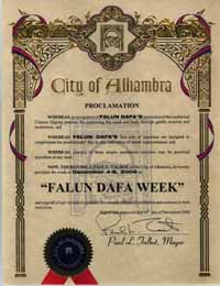 因此,我,阿罕布拉市的保罗.L.泰伯,特宣布二零零零年十二月四-八日为“法轮大法周”,并且敦促我们所有的市民去认识锻炼和打坐的益处。