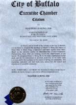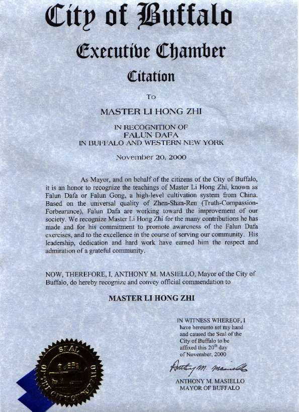 作为市长,代表水牛城市民,荣幸地认知李洪志大师传授的中国高层次修炼体系--法轮大法(或法轮功)。基于宇宙的真,善,忍特性,法轮大法致力于改善我们的社会。我们赞誉李洪志大师的多方面的贡献,致力于推广法轮大法,以及对于公共社会服务的杰出作用。他的领导,贡献及努力工作赢得了公共社会的尊敬和赞誉。