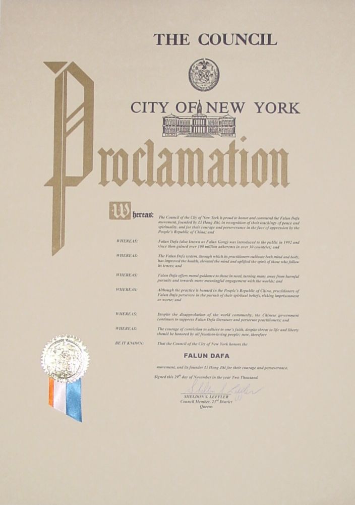鉴于纽约市市议会荣幸地授予和推荐由李洪志先生创建的法轮大法,以表彰他们倡导的和平与高尚精神,以及面对中国的压制他们所表现的勇气和坚韧;