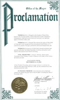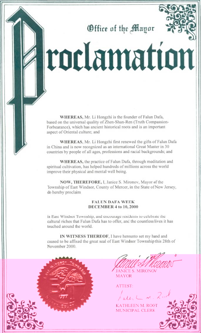 新泽西州东文瑟镇宣布12月4日至10日为法轮大法周