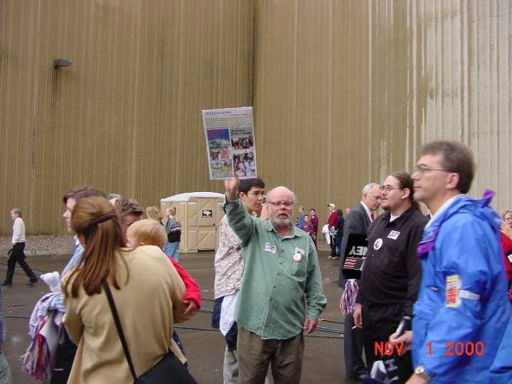 10月31日下午共和党总统候选人布什在太阳村(SUN COUNTRY)机场的演讲活动吸引了约8000名选民参加。学员们高举宣传真相的板报,吸引了大部分陆续出场的选民们.有的人驻足观看索要传单,不少人做出手势表示对我们的赞扬和支持,有的人走过来拍着学员的肩膀表示鼓励.还有一位老人主动要求帮助我们举板报,学员欣然接受了他的请求,并为他感到高兴.