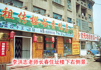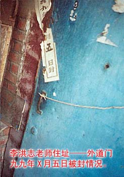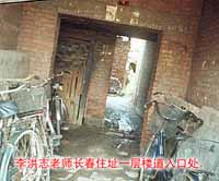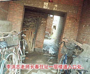 二零零零年三、四月间,笔者在和几位同路人在长春逗留期间,通过民间走访,克服了不少困难,终于有幸找到了李洪志先生原长春住宅,即长春解放大路103号地段内一栋极为普通极为陈旧的市民住宅楼(请见照片1),从楼的结构及内外环境等可看出离新闻报道的所谓“豪宅”相差十万八千里之遥(请见照片3,4)。李洪志先生家住四楼,也是楼房最顶层(请见照片5)。房门被一张一九九九年字样的封条封着(请见照片2)。从外部看,细心的人不难发现,通往李洪志先生家的电话线已被剪断。