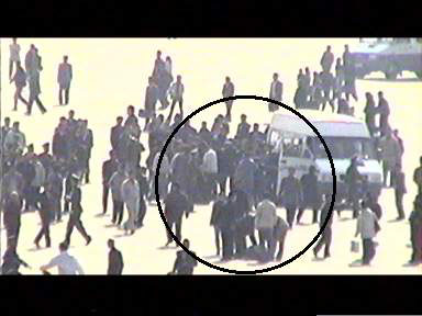 | 1. 大批弟子被强行塞进一辆警车 | 2. 几名便衣挟持着一名弟子向警车走去 |