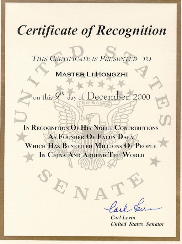 【明慧网2000年12月10日】密西根州美国参议员卡尔 - 列文 (Senator Carl Levin) 在五大湖区法会召开之际签发给李洪志大师荣誉证书,内容如下: