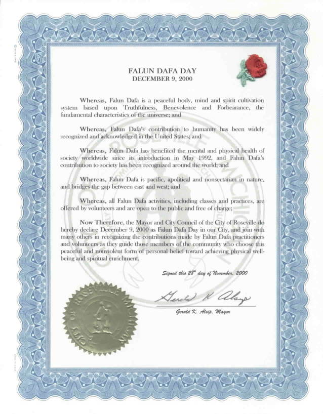 为此罗斯威尔市议会市长特此郑重宣布2000年12月9号为本市法轮大法日,并和广大市民一起表彰法轮大法修炼者为指导市民选择这一和平的、非暴力的个人信仰形式并达到身心俱佳所做的贡献。
