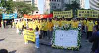 ![]() 4.学员捧着纪念死难者花圈走向中联办递信 | ![]() 5.在中联办对面炼静功 |