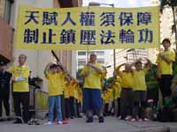 ![]() 1.学员在遮打花园集会 | ![]() 2.浩浩荡荡走过大街 | ![]() 3.在中联办对面集体炼功 |