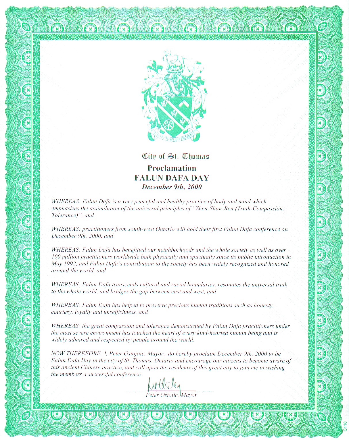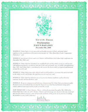加拿大圣.涛姆斯市颁发法轮大法日褒奖 【明慧网】