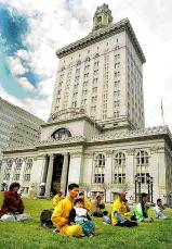 奥克兰 -- 礼拜四下午,十几名和平的抗议人士站在奥克兰市政厅外,支持法轮功,一个能够去病健身的中国古老功法,法轮功现被中国政府取缔。
