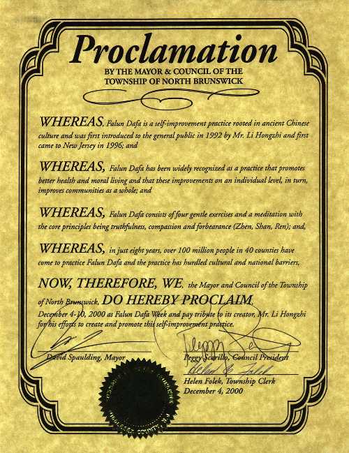 【明慧网2000年12月15日】新泽西州北布朗斯维克市市长宣布2000年12月4-10日为法轮大法周