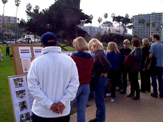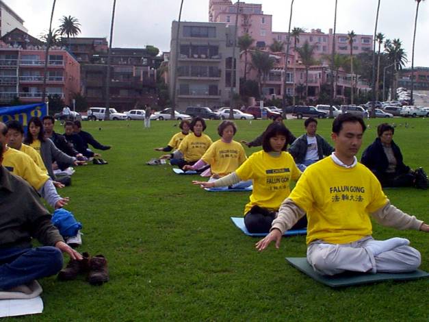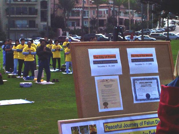 【明慧网2000年12月16日】 最近一段时间,圣地亚哥几个城市相继宣布了“法轮大法周”。12月10日星期天,我们在风景秀丽的拉荷雅湾举行了庆祝活动。我们在海边的行人走道边放上了四块法轮功展板和这些城市的褒奖状,在面对大海的草坪上拉开了“法轮大法”的横幅。来自圣地亚哥各炼功点的学员和部分来自橙县及洛杉矶的学员席地而坐。首先宣布了鲍威市(The City of Poway)、圣马尔科斯市 (The City of San Marcos) 和海滨市 (The City of Oceanside) 的“法轮大法周”褒奖令。然后,学员们排成整齐的队形炼习五套功法。