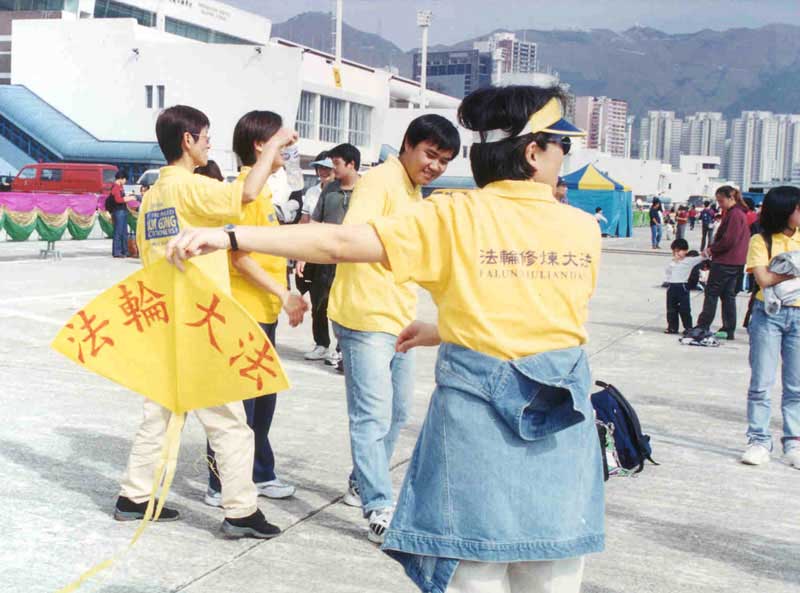 那天,蓝天白云,阳光普照,上千只风筝在启德机场上空飞舞,停机坪人山人海。几位大法学员将写着“法轮大法”和“真、善、忍”的风筝送上晴天。作为学员,蓝天中飞舞的风筝意义是十分深远,我们都十分希望徐徐上升的大法风筝能唤醒广大市民正视大法和大陆学员在中国所遭受的残酷迫害。我们的风筝不大,在风中机智地穿插,绕过阻碍迎风飘扬。有几个市民看到“法轮大法”很惊讶地说:“法轮功?!”老老少少的大法学员健康的面貌轻快的脚步也令他们感到意外。除了在停机坪上放风筝的学员外,一部分学员一如以往在场外派发讲清真相的大法资料。