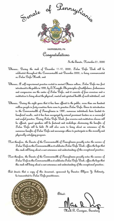 【明慧网2000年12月19日】 宾西法尼亚州参议员艾仑生 Y. 史瓦慈(Allyson Y. Schwartz)祝贺法轮大法周(2000年12月11日--17日)
