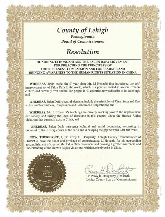 宾州理海县县长褒奖李洪志先生和法轮大法 【明慧网】